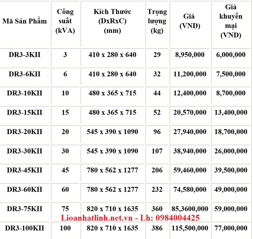 Bảng Giá bán Ổn áp lioa 3 pha model DR3