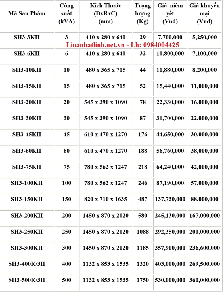 Bảng Giá bán Ổn áp lioa 3 pha model SH3