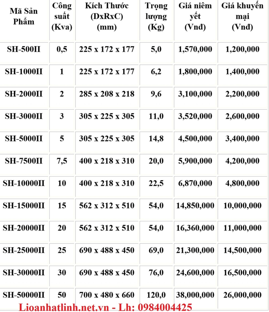 Thương hiệu: Lioa Nhật Linh Loại: Bảng giá ổn áp lioa 1 pha