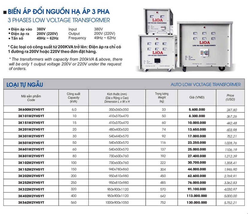 - Biến áp 10kva lioa dùng để biến đổi điện áp 3 pha 380v thành điện áp 200v - 220v 3 pha mà tần số vẫn không thay đổi để sử dụng cho các thiết bị nhập khẩu từ Nhật Bản, Mỹ , Đài Loại...và các nhu cầu đặc biệt khác