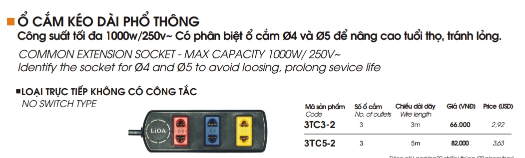 Bảng giá ổ cắm điện lioa 3 lỗ dây dài 3m - 5m. Bán buôn bán lẻ ổ cắm lioa 3 lỗ giá rẻ, chiết khấu cao, ưu tiên khách hàng mua số lượng lớn