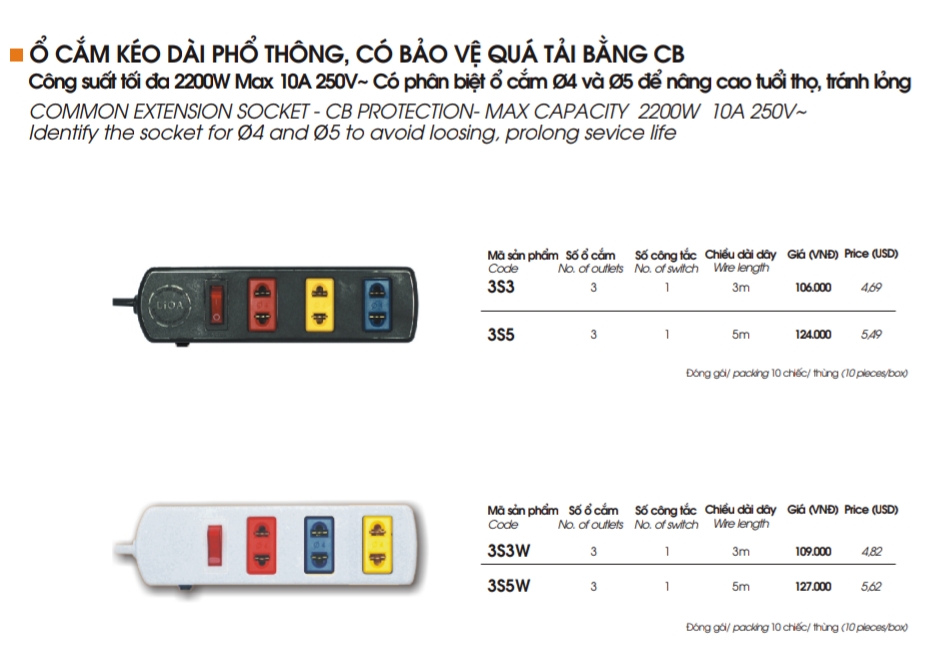 - Số ổ cắm: 03 ổ cắm 2 chấu