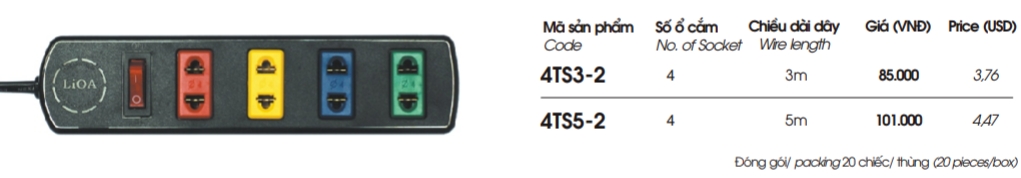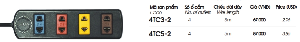 Bảng giá ổ cắm điện lioa 4 lỗ dây dài 3m - 5m. Bán buôn bán lẻ ổ cắm lioa 4 lỗ giá rẻ, chiết khấu cao, ưu tiên khách hàng mua số lượng lớn