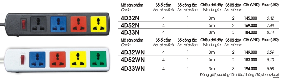 - Số ổ cắm: 04 ổ cắm 2 chấu