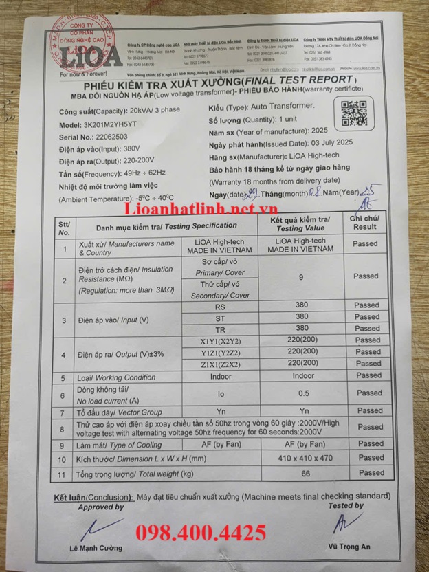 ( MẪU CHỨNG CHỈ XUẤT XƯỞNG KIÊM PHIẾU BẢO HÀNH BIẾN ÁP LIOA 3 PHA 20KVA)