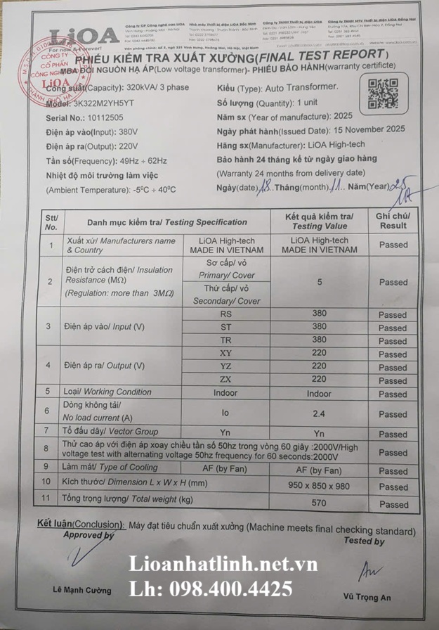 ( MẪU CHỨNG CHỈ XUẤT XƯỞNG KIÊM PHIẾU BẢO HÀNH BIẾN ÁP LIOA 300KVA 3 PHA)