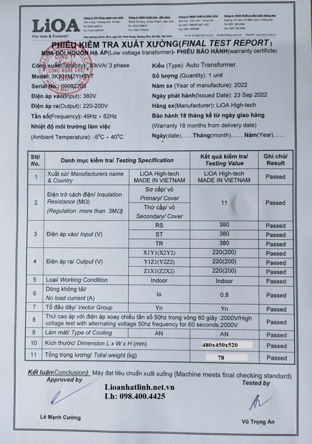 - Biến áp lioa 30kva bảo hành 18 tháng kể từ ngày mua