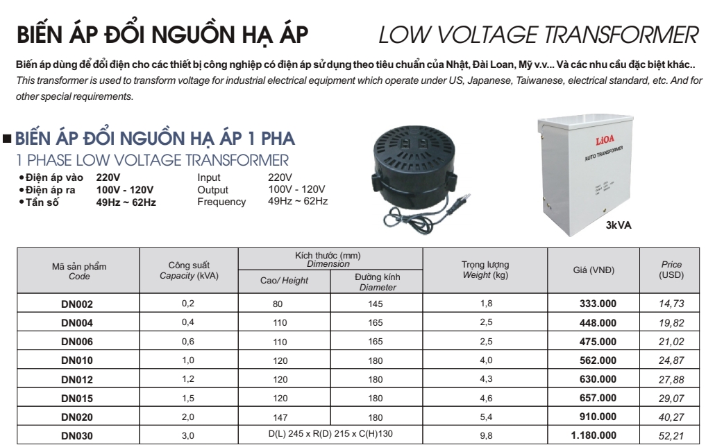 BẢNG GIÁ BIẾN THẾ 220V RA 100V CÁC LOẠI NHƯ SAU