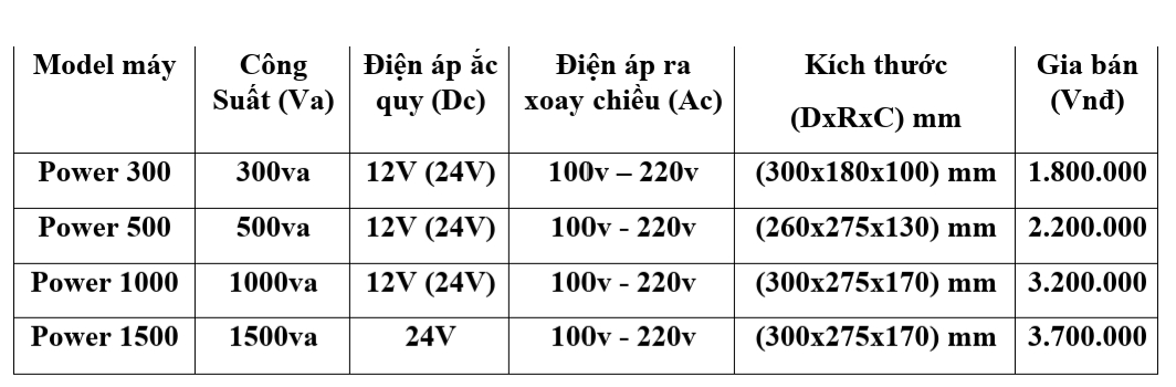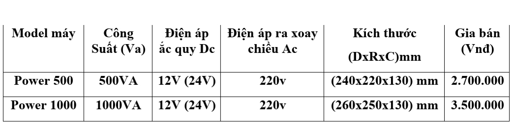 - Bảng giá kích điện 24v lên 220v robot sin chuẩn các loại như sau