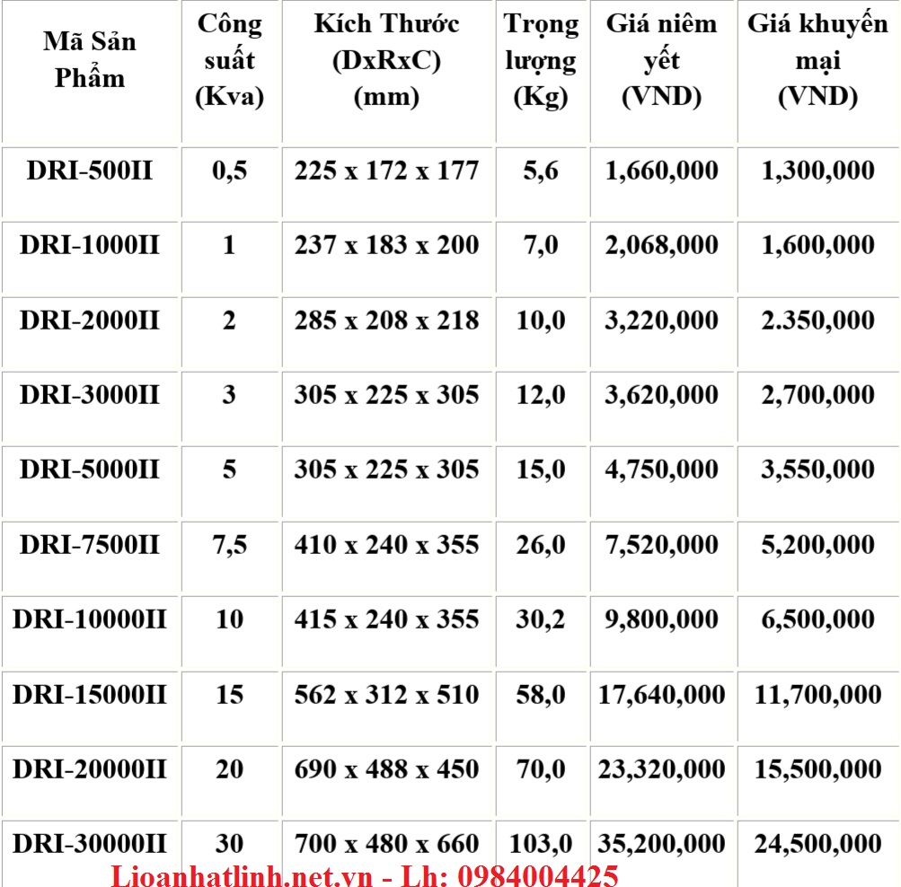 BẢNG GIÁ ỔN ÁP LIOA 1 PHA MODEL DRI ( 90V - 250V)