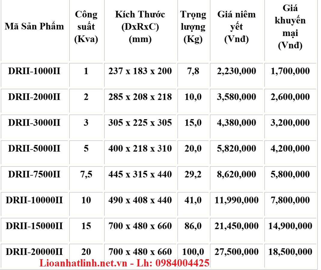 BẢNG GIÁ ỔN ÁP LIOA 1 PHA MODEL DRII ( 50V - 250V)