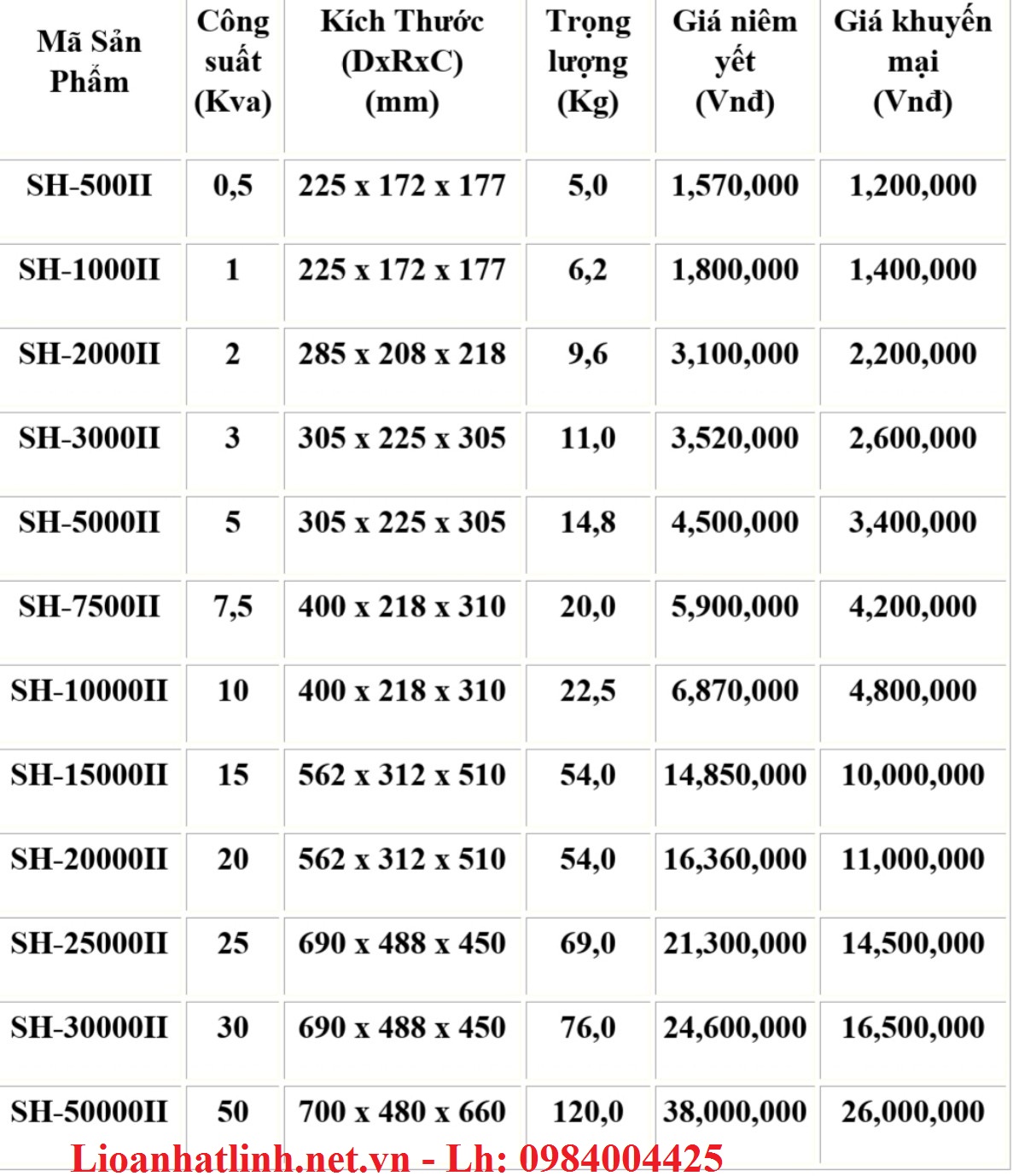 BẢNG GIÁ ỔN ÁP LIOA 1 PHA MODEL SH ( 150V, 130V-250V)