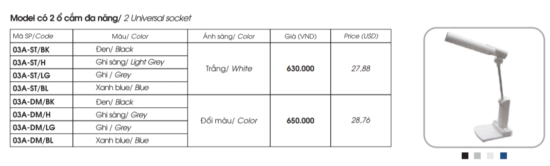 - 03A-ST/BK ( Mầu đen có thêm 02 ổ cắm đa năng 10A, ánh sáng trắng) - 03A-DM/BK ( Mầu đen có thêm 02 ổ cắm đa năng 10A, ánh sáng đổi mầu) - 03A-ST/H ( Mầu nghi sáng có thêm 02 ổ cắm đa năng 10A, ánh sáng trắng) - 03A-DM/H ( Mầu nghi sáng có thêm 02 ổ cắm đa năng 10A, ánh sáng đổi mầu) - 03A-ST/LG ( Mầu nghi có thêm 02 ổ cắm đa năng 10A, ánh sáng trắng) - 03A-DM/LG ( Mầu nghi có thêm 02 ổ cắm đa năng 10A, ánh sáng đổi mầu) - 03A-ST/BL ( Mầu xanh có thêm 02 ổ cắm đa năng 10A, ánh sáng trắng) - 03A-DM/BL ( Mầu xanh có thêm 02 ổ cắm đa năng 10A, ánh sáng đổi mầu) |