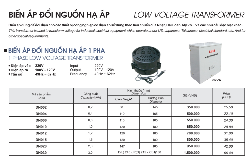 - Nhằm đáp ứng các nhu cầu sử dụng thiết bị nhập khẩu từ Nhật Bản, Mỹ…. Công Ty TNHH Lioa Nhật Linh sản xuất đổi nguồn lioa có các loại công suất từ 200va – 2000va với giá cả rất hợp lý mà độ bền cao đã được khẳng định trong nhiều năm qua