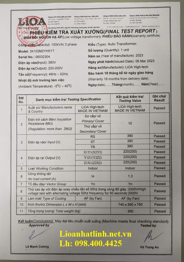 - Trạm biến áp 100kva do Lioa Nhật Linh sản xuất, bảo hành 18 tháng, miễn phí giao hàng trên toàn quốc