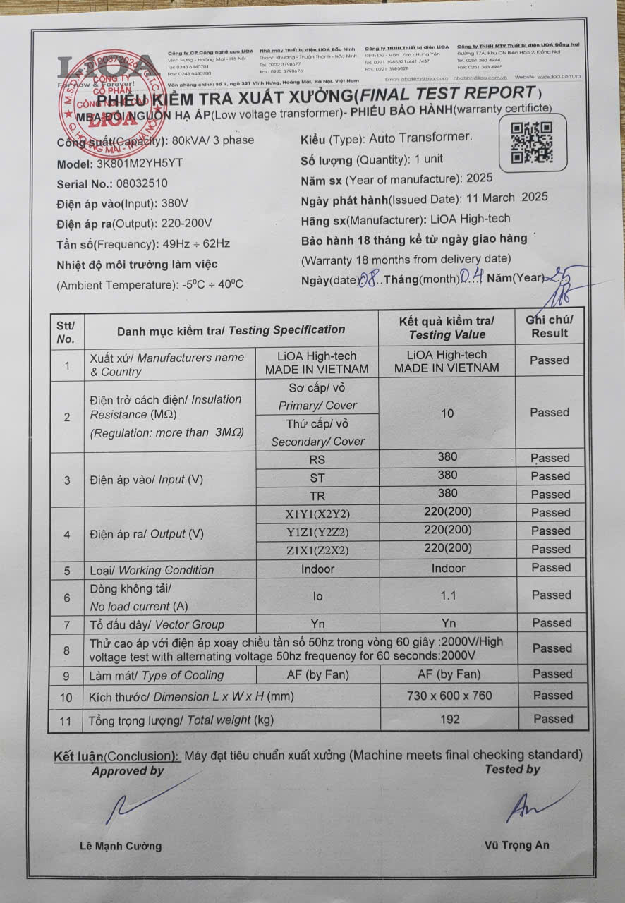 - Trạm biến áp 80kva do Lioa Nhật Linh sản xuất, bảo hành 18 tháng, miễn phí giao hàng trên toàn quốc