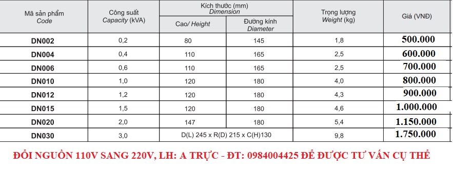 - Chi tiết giá tiền, trọng lượng, công suất bộ đổi nguồn điện 110v sang 220v mời quý khách xem phía dưới