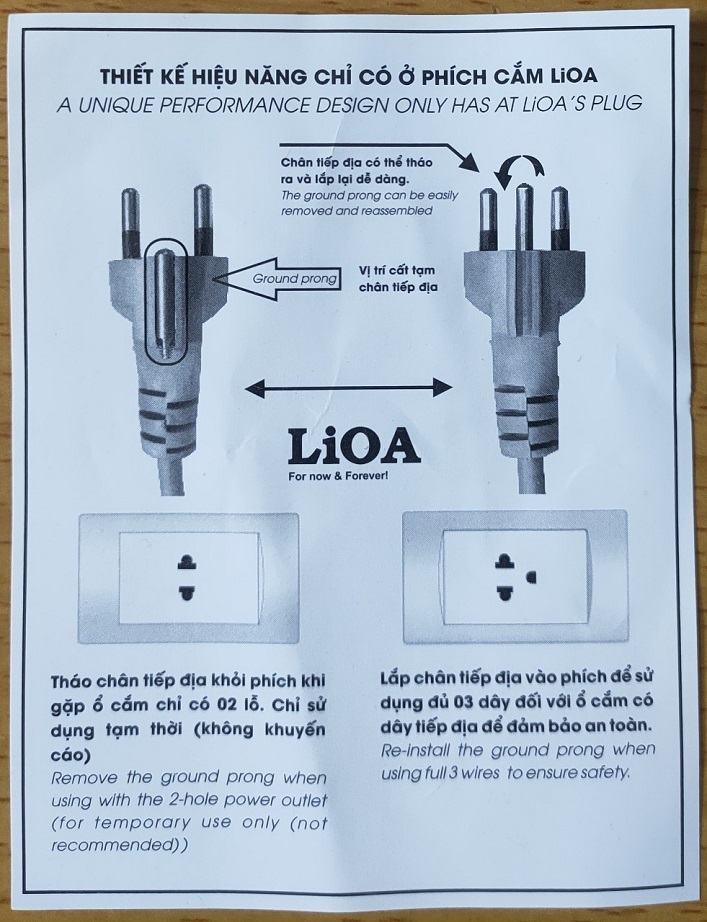 03 Lõi ( Ổ cắm lioa 6 lỗ công suất lớn có tiếp địa - nối đất, thiết kế mới của chân tiếp địa có thể tháo ra và gài lại tránh làm mất trên đầu phích cắm khi không có nhu cầu sử dụng và lắp lại rễ dàng khi có nhu cầu sử dụng chân tiếp địa) |