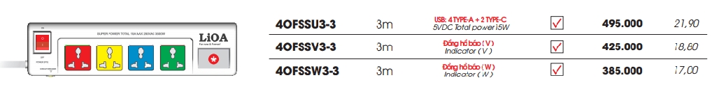 - Từ năm 2023 công ty Lioa đã thay đổi mẫu mã hầu hết các loại ổ cắm lioa chính vì thế ổ cắm lioa 4 lỗ công suất lớn model cũ là 4OFSSV2.5-2 đã đổi thành ổ cắm 4 lỗ công suất lớn lioa 3300w có model 4OFSSV3-3 với mẫu mới đẹp hơn, cắm được hầu hết các loại phích cắm trên thế giới. Sản phẩm mới có chất lượng rất tốt, bảo hành lên đến 10 năm
