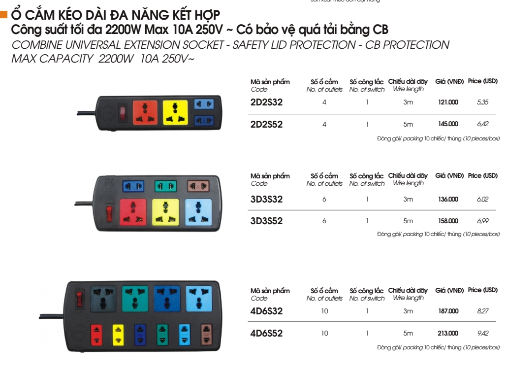 10 ổ cắm ( 04 ổ cắm đa năng 3 chấu + 06 ổ cắm 2 chấu) |