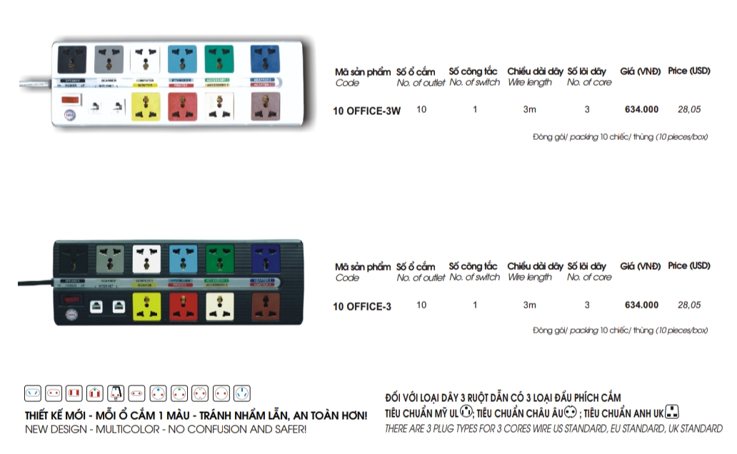 Vỏ ổ cắm màu đen hoặc mầu trắng, 10 ổ cắm mầu xanh, đỏ, vàng..... |