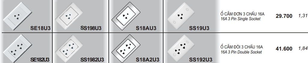 + Ổ cắm đơn 3 chấu lioa model SE18U3, SS198U3, S18AU3, SS19U3, E18SD, SS198D, S18AD, SS19D