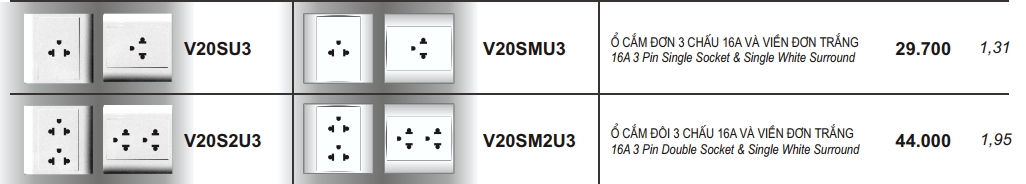 + Ổ cắm đơn 3 chấu lioa loại vuông model V20SU3, V20SMU3, V20SDN, V20SMDM, V20SDNV, V20SMDNV