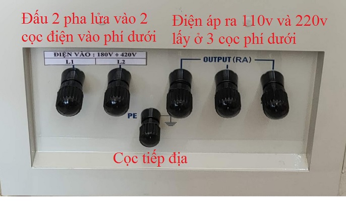 + Đối với quý khách đã có sẵn điện 3 pha ( 3 dây lửa, 1 dây mát ) quý khách chỉ việc đấu 2 dây lửa vào đầu vào của máy ( Bỏ 1 dây lửa và 1 dây mát đi hoặc quý khách dùng cho thiết bị khác). Điện áp ra sử dụng cho các thiết bị 100v, 220v đấu vào cọc đấu dây đầu ra