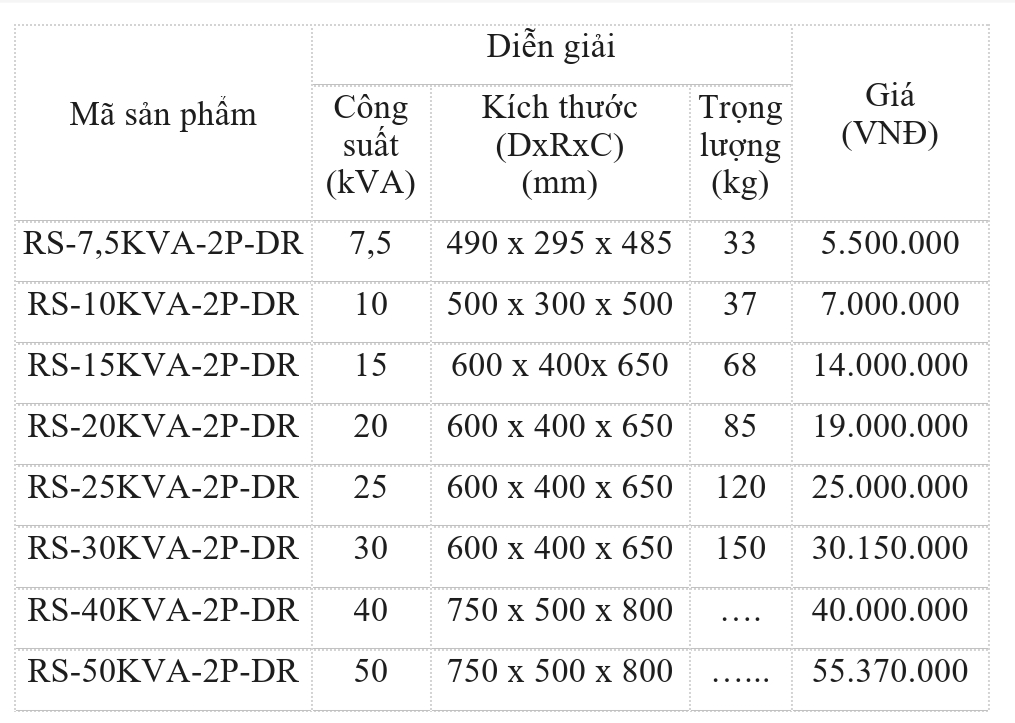 BẢNG GIÁ ỔN ÁP 2 PHA LỬA HÃNG STANDA, STANDA - RS CÁC LOẠI