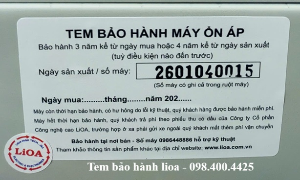 - Ổn áp lioa 10kva 1 pha bảo hành 48 tháng kể từ ngày sản xuất, 06 tháng đầu máy hỏng đổi máy mới