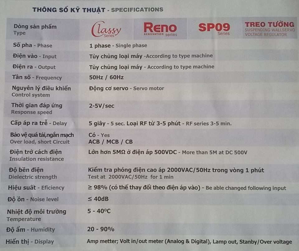 THÔNG SỐ KỸ THUẬT ỔN ÁP ROBOT 1 PHA