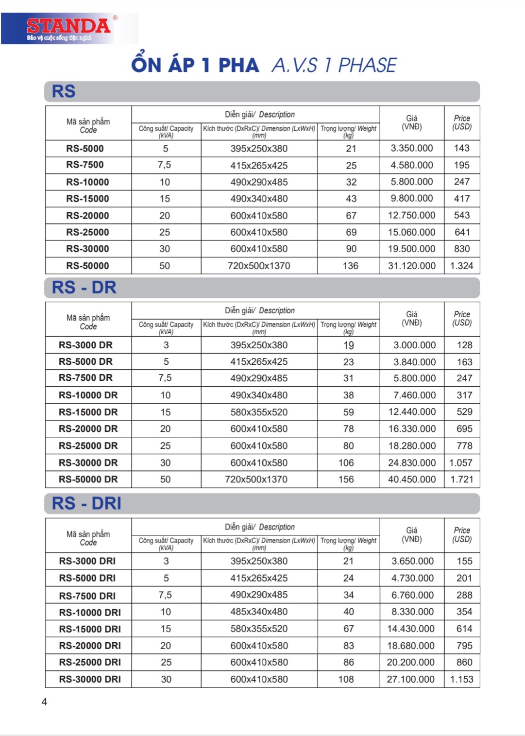 - Dưới đây là bảng giá niêm yết ổn áp standa 1 pha các loại