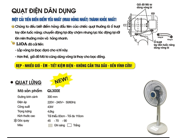 - Quạt lửng lioa ql 300 có gối đỡ mô tơ, ổ trượt tay đòn tuốc năng dùng vòng bi khép kín không cần bảo dưỡng định kỳ nên bền vĩnh cửu không lo bị sát cốt
